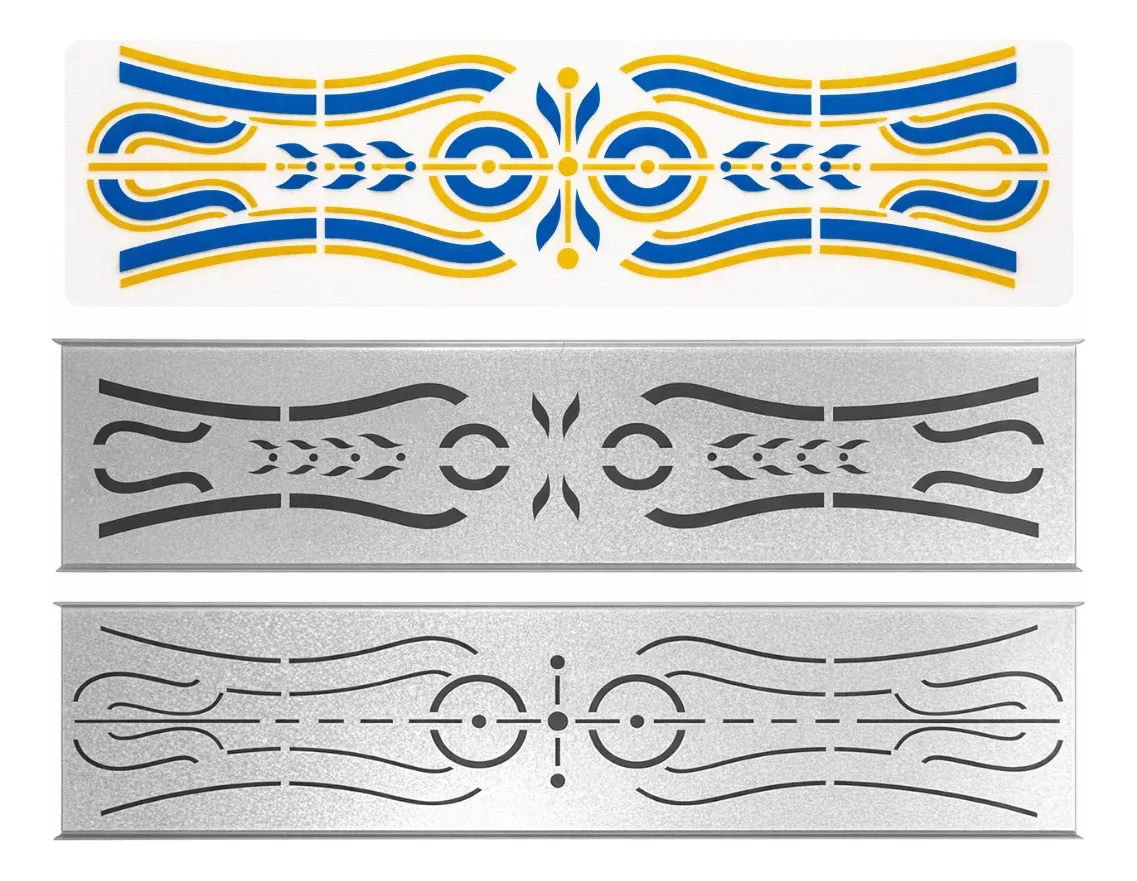 Molde Stencil p/ Pintura Carroceria Caminhão Reutilizável Descrição do Produto: Molde stencil ornamental desenvolvido especialmente para decoração de carrocerias de caminhão, inspirado nos filetes tradicionais brasileiros. Ideal para quem busca um acabamento profissional, padronizado e de alta durabilidade na pintura. Fabricado em chapa galvanizada, permite múltiplas reutilizações sem deformar, garantindo traços limpos e alinhados mesmo em aplicações longas. Especificações Técnicas: Tipo: Molde vazado (Stencil) Aplicação: Pintura decorativa em carrocerias Material: Chapa galvanizada de alta resistência Espessura: 0,5 mm Quantidade: 2 módulos Dimensão total montada: 500 × 120 mm Padrão: Ornamental clássico / tradicional Reutilizável: Sim Tipo de Pintura Indicada: Pintura com spray e rolo Ideal para pintura manual Não indicado para pincel Vantagens do Produto: Permite repetição do padrão ao longo da carroceria Alinhamento fácil graças à sobreposição entre módulos Desenho contínuo sem falhas visuais Bordas reforçadas para maior vida útil Estilo tradicional valorizado no transporte rodoviário Pode ser aplicado em madeira, metal ou chapa pintada Indicações de Uso: Caminhões com carroceria de madeira Reforma ou personalização de carrocerias Oficinas de pintura Pintores autônomos Frotistas e transportadoras Conteúdo da Embalagem: 01 conjunto de molde stencil ornamental (2 módulos) Observações Importantes: Produto não acompanha tinta As cores das imagens são meramente ilustrativas Recomenda-se fixar o stencil com fita
